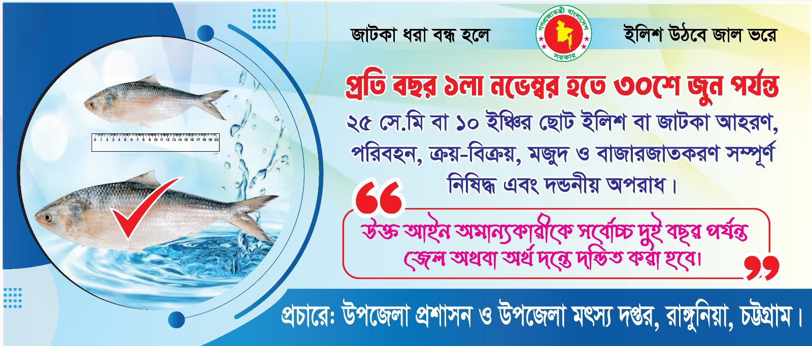 | ২ | প্রতি বছর ১ লা নভেম্বর হতে ৩০শে জুন পর্যন্ত ২৫ সেমি বা ১০ ইঞ্চির ছোট ইলিশ বা জাটকা আহরণ, পরিবহন, ক্রয়-বিক্রয়, মজুদ ও বাজারজাতকরণ সম্পূর্ণ নিষেধ করেছে সরকার | | ৩০-১০-২০২৫ | দেখুন | |